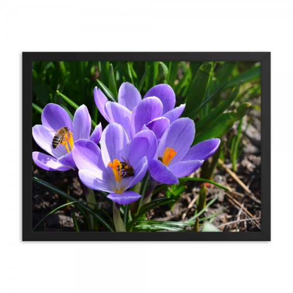 Crocus Flower and Bees enjoying early Spring sun. Framed poster